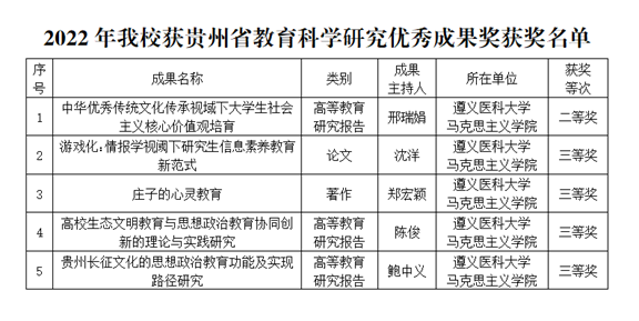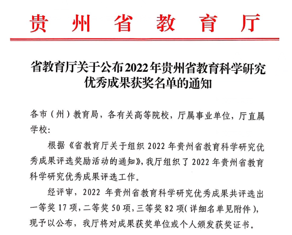 近日,贵州省教育厅发布了《关于公布2022年贵州省教育科学研究优秀成果奖名单的通知》,公司共有5项成果获奖,均为williamhill英国威廉希尔教师获得。其中,二等奖1项,三等奖4项,获奖数量位居全省高校第四名,蝉联我省医学类高校第一名。