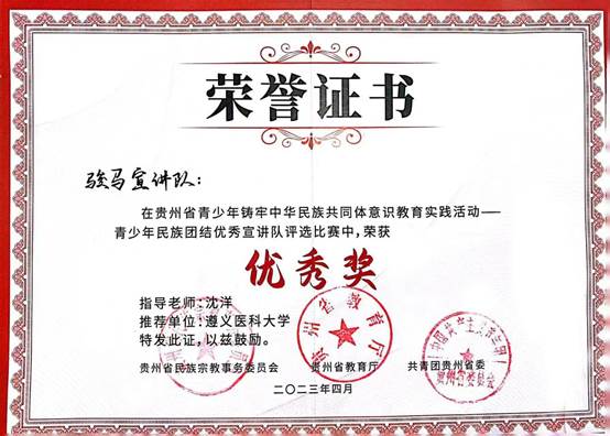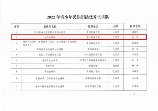 近日,贵州省民族宗教事务委员会、省教育厅、团省委正式公布全省2022年青少年民族团结优秀宣讲队评选结果(共评选10支),公司williamhill英国威廉希尔硕士生导师沈洋副教授指导的“骏马”宣讲队成功入选,是遵义市唯一一支获此殊荣的队伍,体现公司思想政治教育专业研究生的培养水平,展现公司师生理论宣讲所取得的显著成效。