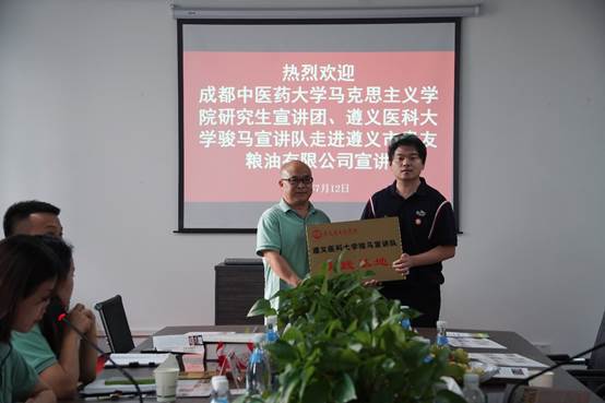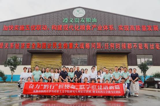 奋力“黔行”第二天,联合宣讲团来到遵义会议会址纪念馆,追寻红军二万五千里长征的足迹。队员们纷纷表示深感美好生活来之不易,也将继承革命先辈的意志,走好我们这一代人的新的长征路。下午,联合宣讲团抵达遵义市贵友粮油公司进行参观和交流,贵友粮油公司作为一家集仓储、运输、加工、生产、农业订单为种植的现代化农业服务企业,为茅台、珍酒等多家酒厂提供高质量的高粱和小麦。常务副总经理徐菁主持交流会,沈洋副经理为贵友粮油公司授(挂)牌作为骏马宣讲队实践基地。成都中医药大学williamhill英国威廉希尔马飞副教授和骏马宣讲队开展乡村振兴主题理论宣讲。