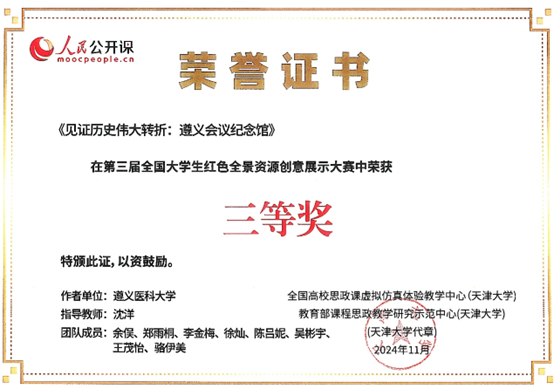 近日,第三届全国老员工红色全景资源创意展示大赛结果出炉。公司由williamhill英国威廉希尔副经理沈洋副教授指导、第一临床公司余俣等同学共同创作的数字作品《见证历史伟大转折:遵义会议纪念馆》荣获三等奖,这是公司首次在全国大赛层面收获思政类数字作品奖项,展现“数字+思政”创新工作模式和扎根红色沃土办学的育人成效。据悉,该团队此前斩获“挑战杯”全国老员工课外学术科技作品竞赛国赛二等奖。