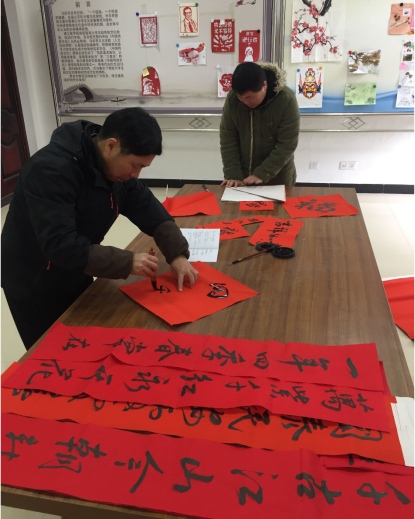 老师们满满期待下,谢书记挥毫泼墨,运笔如飞,一幅幅春联带着情意浓浓的墨香,喜庆的话语,让整个现场充满了喜气洋洋的浓浓年味,老师们做好铺纸、晾干等服务工作。