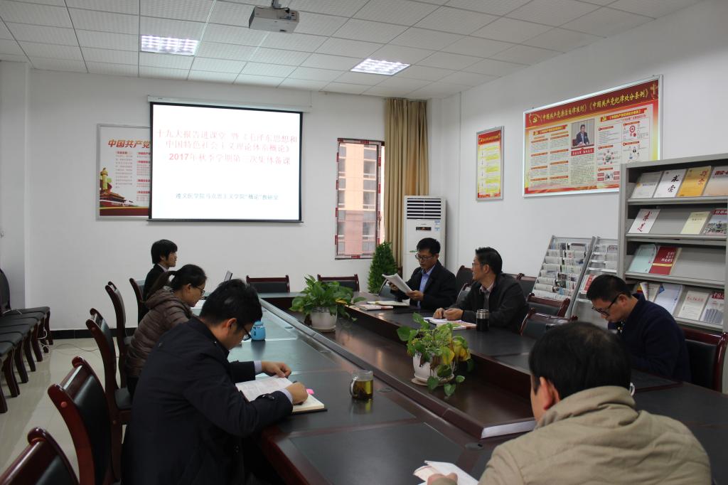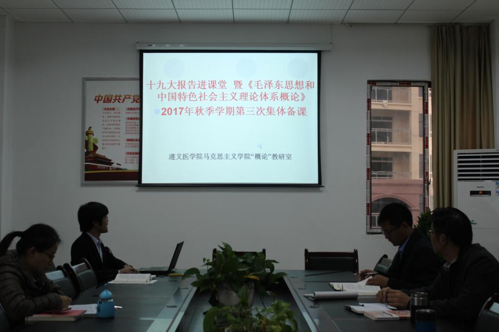 根据公司党委的要求,要通过组织召开各种类型的报告会、学习会、座谈会、研讨会,深化广大师生员工对十九大报告精神的学习和理解。作为高校思想政治理论课教师,我们更应该抓好“十九大报告进课堂”工作,及时将十九大报告中的最新理论成果融入课堂教学中。此次集体备课由“概论”教研室副主任陈俊教授主备,内容为:“第十一章建设中国特色社会主义的根本目的和依靠力量”。陈俊老师认为应当将十九大报告中提出的“以人民为中心”等与本章课程相关的内容融入课堂教学,并对课堂教学的具体环节进行了讲解。