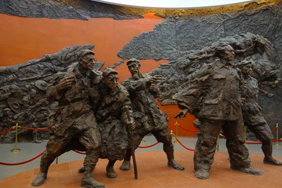 下车后,首先参观四渡赤水纪念馆主馆。四渡赤水之战是红军长征途中最精彩绝伦的军事行动,也是毛主席的毕生之骄傲。馆内成列着许多珍贵的抗战纪念。讲解员为大家细心概述四渡赤水的过程以及分析当中的原由。一个个战争时代的故事牵动着同学们的心,每个人都非常仔细地听着讲解。玻璃展览柜里展示的是当年红军战士们使用过的枪支等武器以及一些生活用品。真真切切的物件与形象生动的讲解协同作用,仿佛将同学们带回到了那个非常时期。
