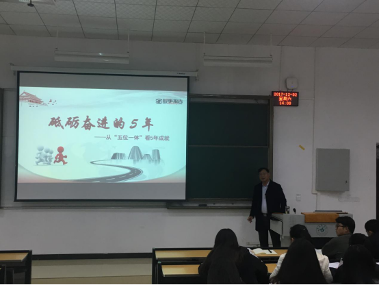 12月2日下午,公司党委副书记刘建国在新蒲校区第二阶梯教室为2017级新生讲授《形势与政策》课。在这堂主旨为“学习和贯彻十九大精神”的课上,刘建国用生动的语言和精辟的讲解,与百余名本科生一起分享了自己对十九大精神的理解和认识。
